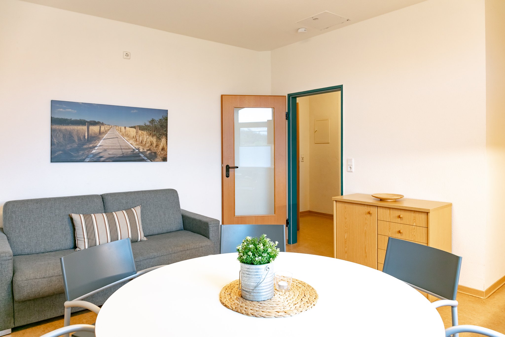 Das Familienappartment E001, verfügt über 50 qm und liegt im Erdgeschoss auf der linken Seite.