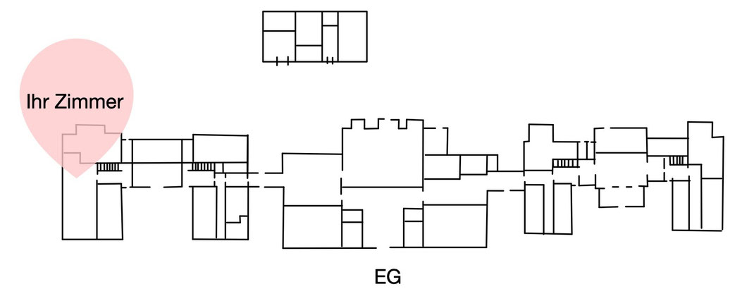 Das Doppelzimmer E004 hat 10 qm und liegt im Erdgeschoss auf der linken Seite.