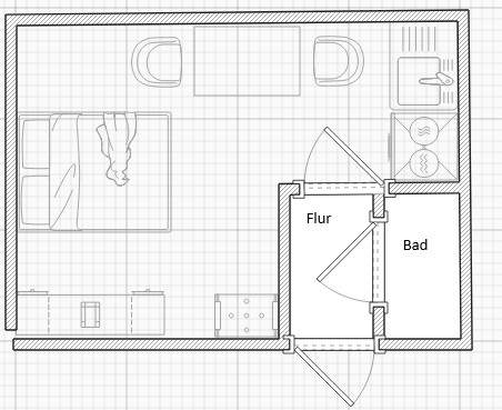 Das Doppelzimmer mit Küche F001 hat 23 qm und liegt im Erdgeschoss auf der linken Seite.