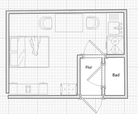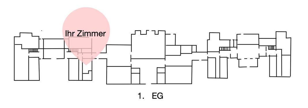 Das Zimmer F102 hat 33 qm und liegt im Haus Loccum auf der linken Seite, in der ersten Etage.