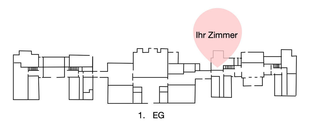 Das Zimmer G101 hat 45 qm und liegt im Haus Loccum auf der rechten Seite, in der ersten Etage.