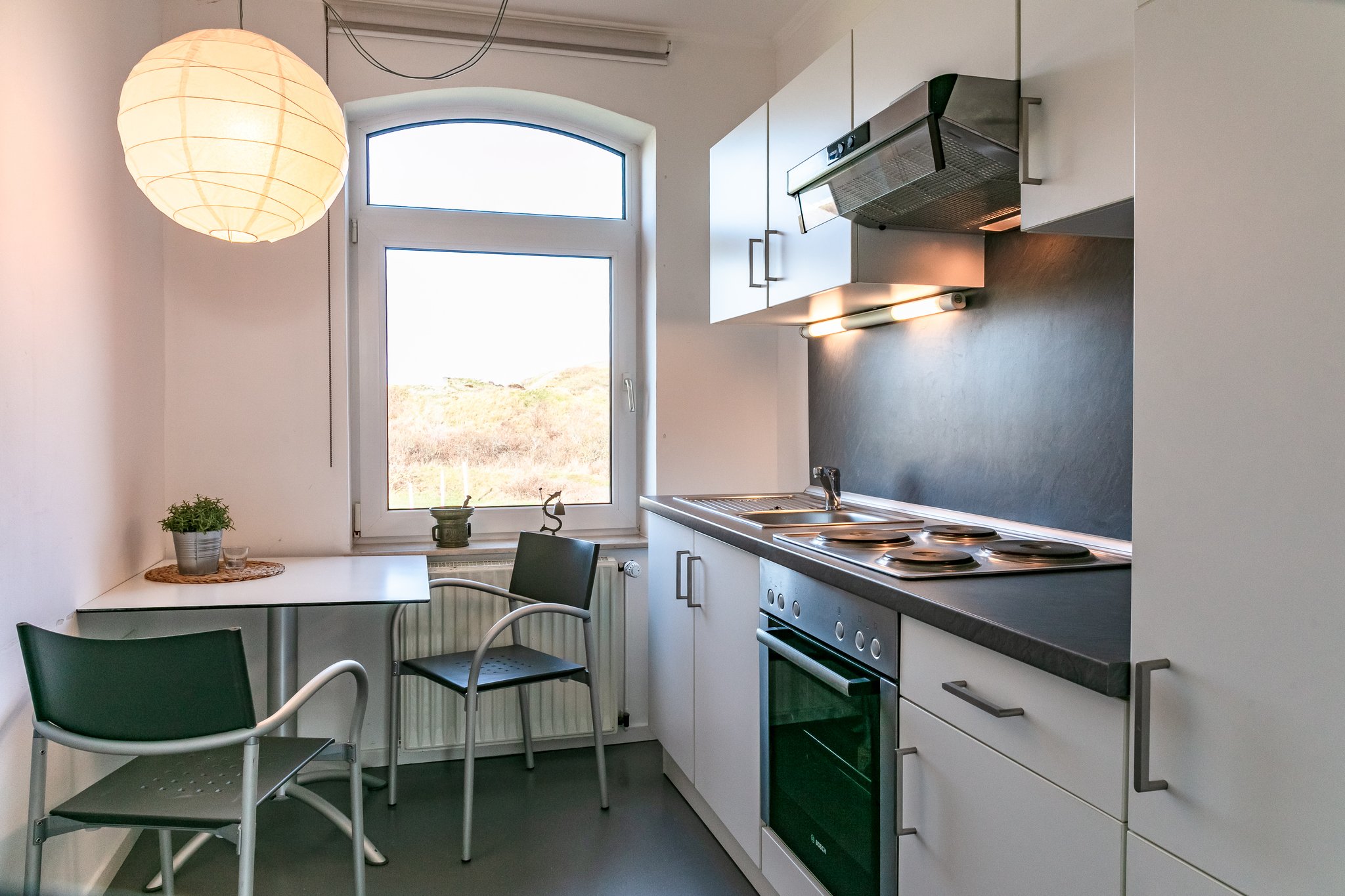 Die Einbauküche ist mit einem Herd, einem Kühlschrank mit Gefrierfach sowie einem Backofen und einer Kaffeemaschine ausgestattet.