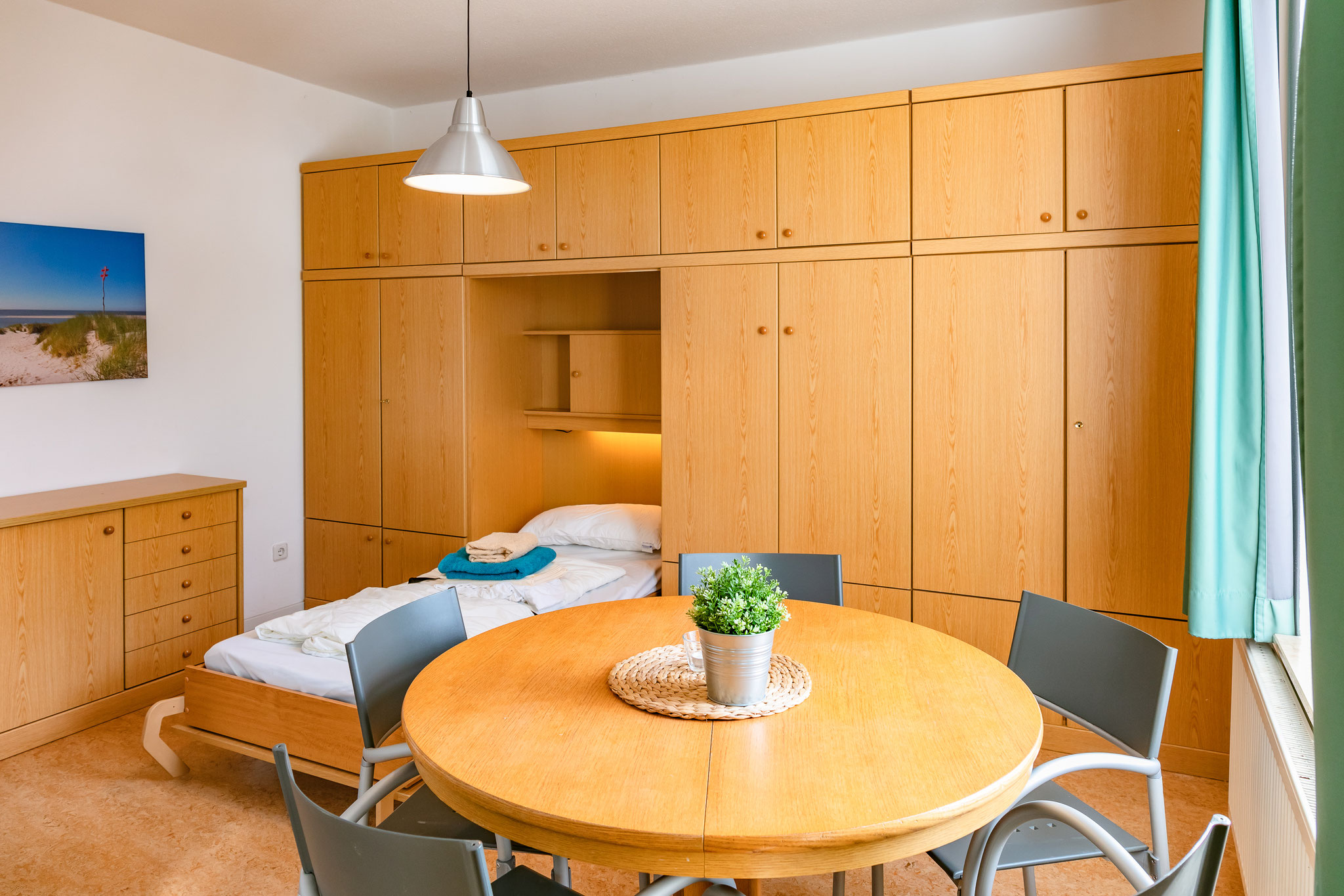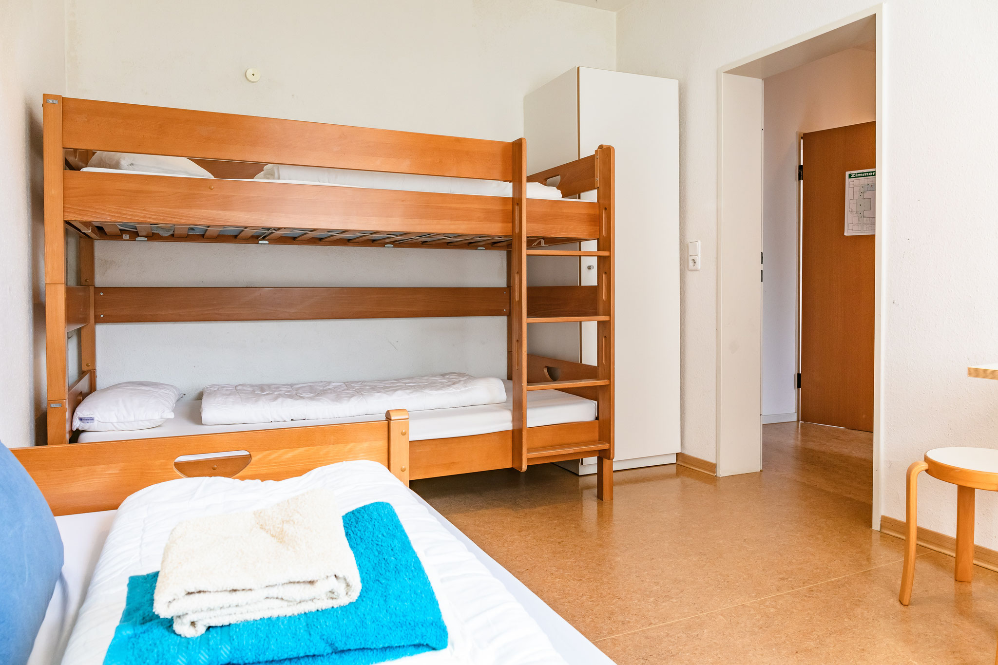 Das Zimmer H004 ist ein helles Appartment mit einem Schrankbett, einem Hochbetten und einem Einzelbett.