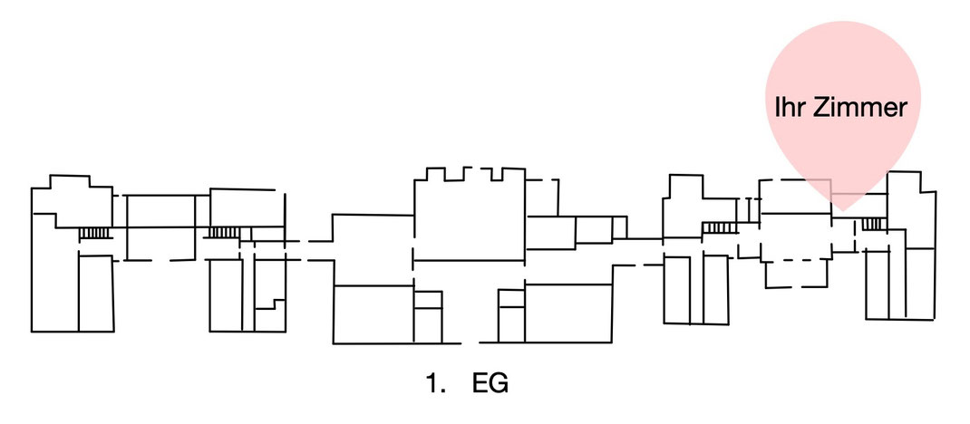 Das Zimmer H105 hat 45 qm und liegt im Haus Loccum auf der rechten Seite, in der ersten Etage.